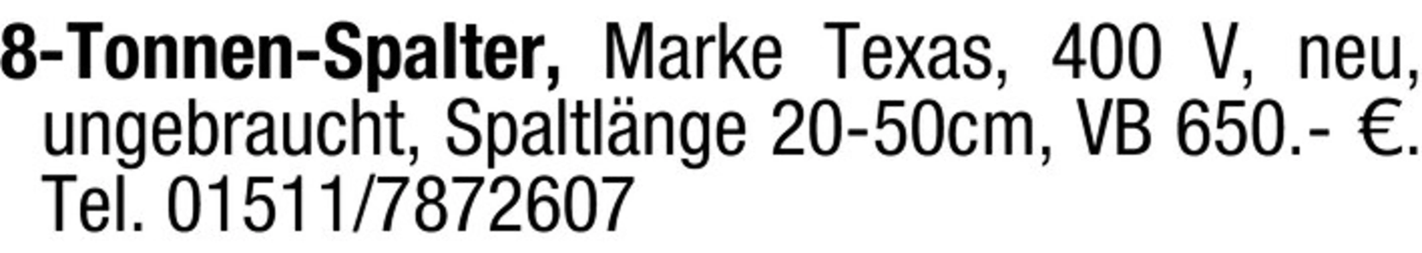 8-Tonnen-Spalter, Marke Texas, 400 V, neu, ungebraucht, Spaltlnge 20-50cm, VB 650.- . Tel. 01511/7872607