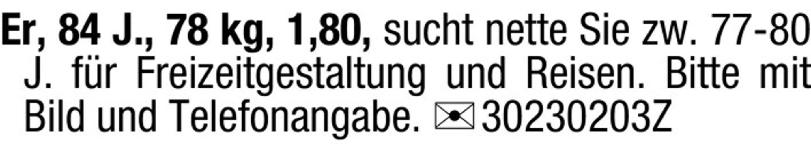 Er, 84 J., 78 kg, 1,80, sucht nette Sie zw. 77-80 J. fr Freizeitgestaltung und Reisen. Bitte mit Bild und Telefonangabe. Chiffre 30230203