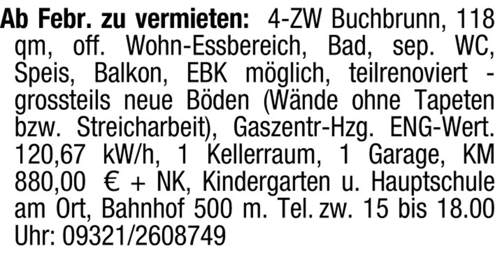text Ab Febr. zu vermieten: 4-ZW Buchbrunn, 118 qm, off. Wohn-Essbereich, Bad, sep. WC, Speis, Balkon, EBK mglich, teilrenoviert - grossteils neue Bden (Wnde ohne Tapeten bzw. Streicharbeit), Gaszentr-Hzg. ENG-Wert. 120,67 kW/h, 1 Kellerraum, 1 Garage, KM 880,00 NK, Kindergarten u. Hauptschule am Ort, Bahnhof 500 m. Tel. zw. 15 bis 18.00 Uhr: 09321/2608749