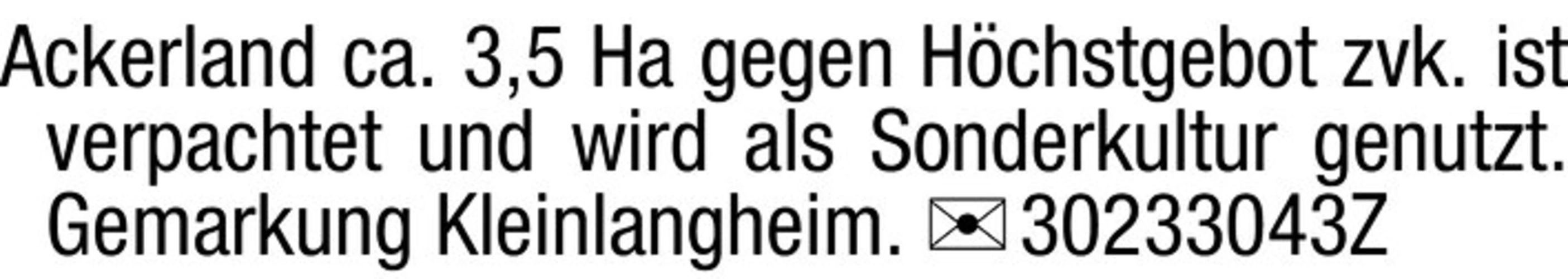 Ackerland ca. 3,5 Ha gegen Hchstgebot zvk. ist verpachtet und wird als Sonderkultur genutzt. Gemarkung Kleinlangheim. Chiffre 30233043