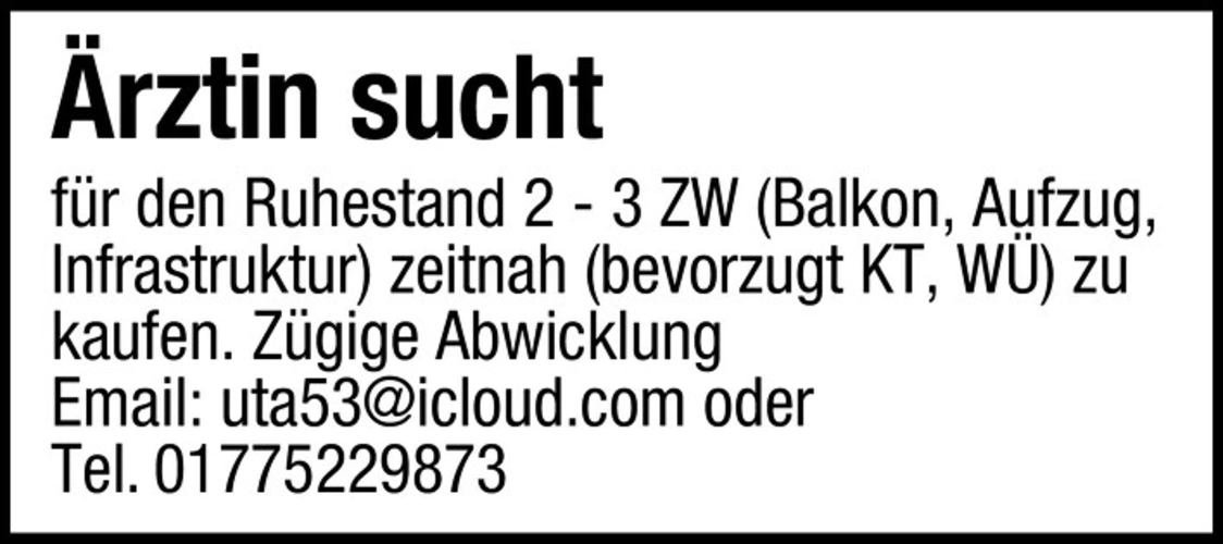 Ärztin sucht für den Ruhestand 2 - 3 ZW (Balkon, Aufzug, Infrastruktur) zeitnah (bevorzugt KT, W) zu kaufen. Zügige Abwicklung
