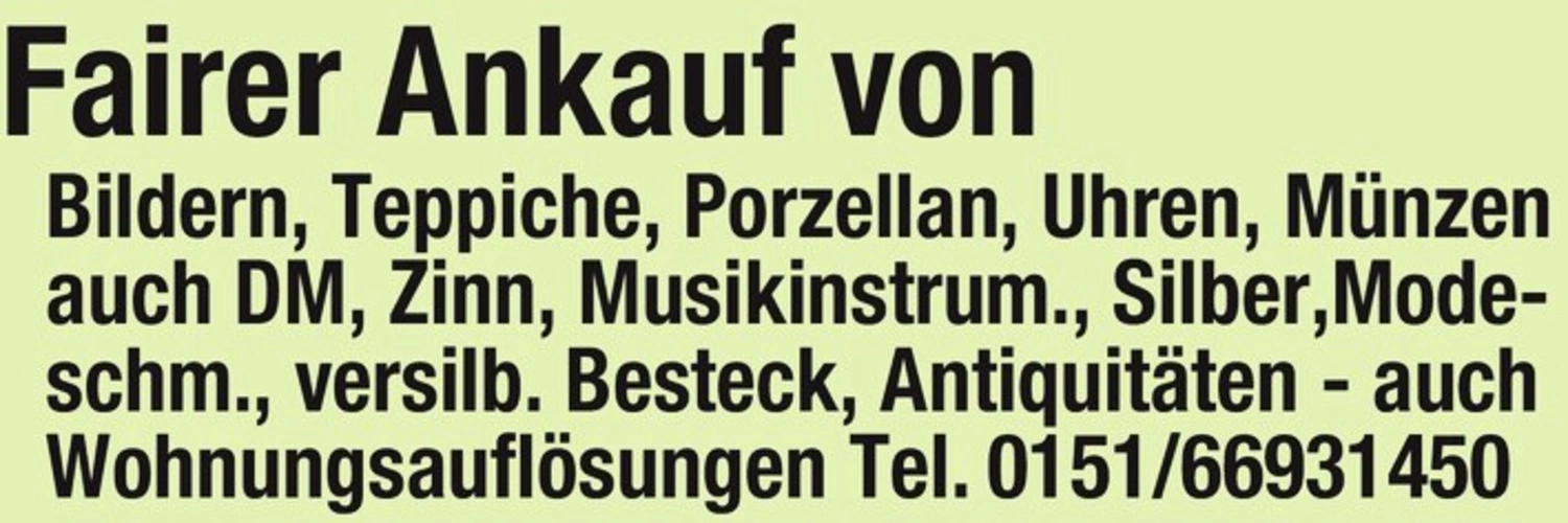 Fairer Ankauf von Bildern, Teppiche, Porzellan, Uhren, Münzen auch DM, Zinn, Musikinstrumente, Silber, Modeschmuck, versilbertes Besteck, Antiquitäten - auch Wohnungsauflösungen