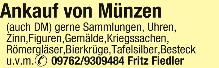 Ankauf von Münzen (auch DM) gerne Sammlungen, Uhren, Zinn, Figuren, Gemälde, Kriegssachen, Römergläser, Bierkrüge, Tafelsilber, Besteck u.v.m.