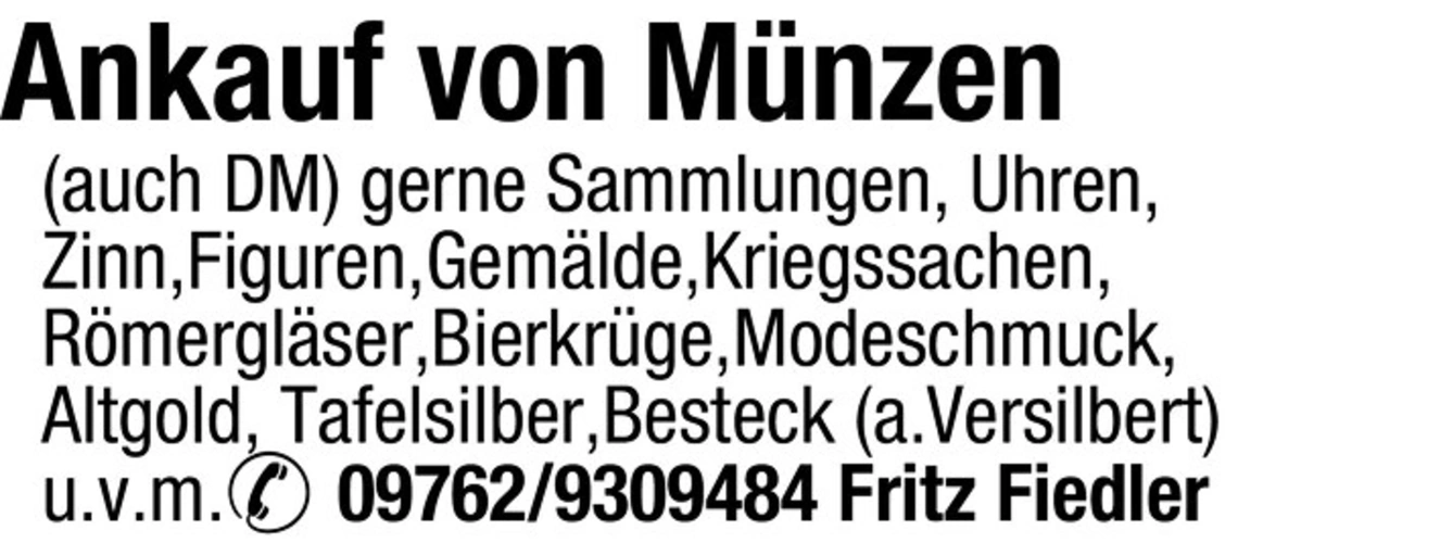 text Ankauf von Mnzen (auch DM) gerne Sammlungen, Uhren, Zinn,Figuren,Gemlde,Kriegssachen,Rmerglser,Bierkrge,Modeschmuck,Altgold, Tafelsilber,Besteck (a.Versilbert)u.v.m. 09762/9309484 Fritz Fiedler