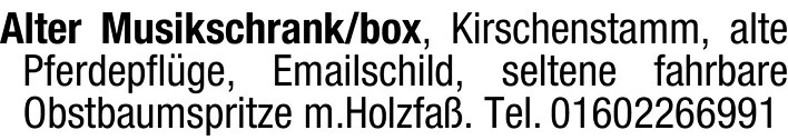 Alter Musikschrank/box, Kirschenstamm, alte Pferdepflege, Emailschild, seltene fahrbare Obstbaumspritze m.Holzfa.