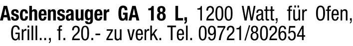 Aschensauger GA 18 L, 1200 Watt für Ofen und Grill