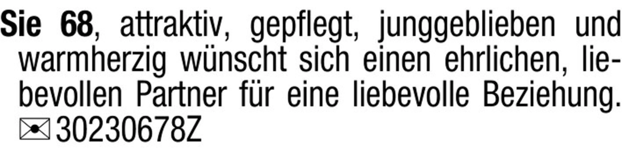 Sie 68, attraktiv, gepflegt, junggeblieben und warmherzig wünscht sich einen ehrlichen, liebevollen Partner für eine liebevolle Beziehung. Chiffre 30230678