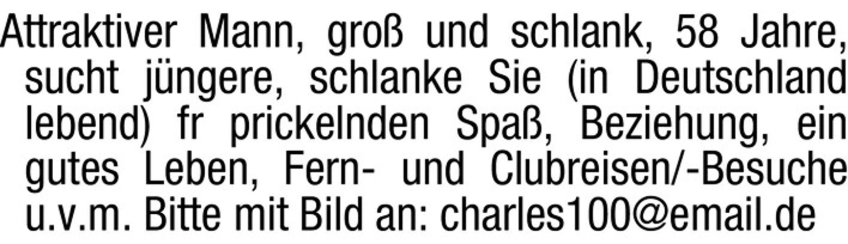 Attraktiver Mann, gro und schlank, 58 Jahre, sucht jngere, schlanke Sie (in Deutschland lebend) fr prickelnden Spa, Beziehung, ein gutes Leben, Fern- und Clubreisen/-Besuche u.v.m. Bitte mit Bild an: charles100@email.de