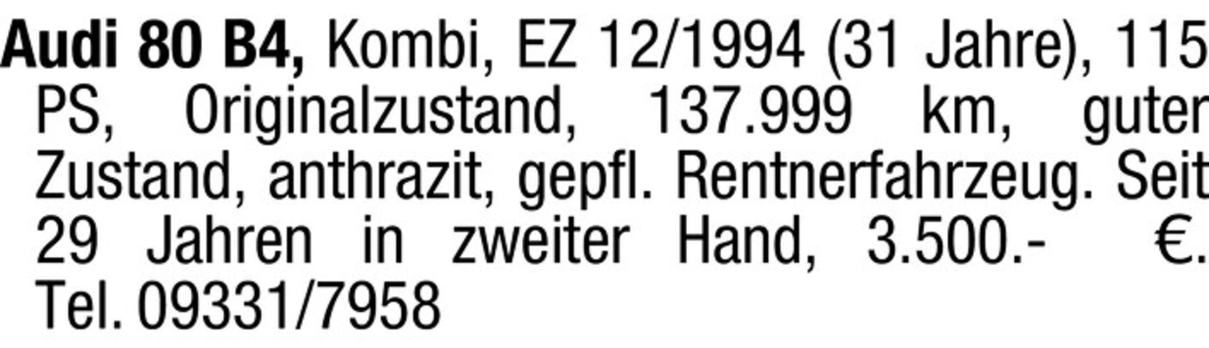 text Audi 80 B4, Kombi, EZ 12/1994 (31 Jahre), 115 PS, Originalzustand, 137.999 km, guter Zustand, anthrazit, gepfl. Rentnerfahrzeug. Seit 29 Jahren in zweiter Hand, 3.500.- . Tel. 09331/7958