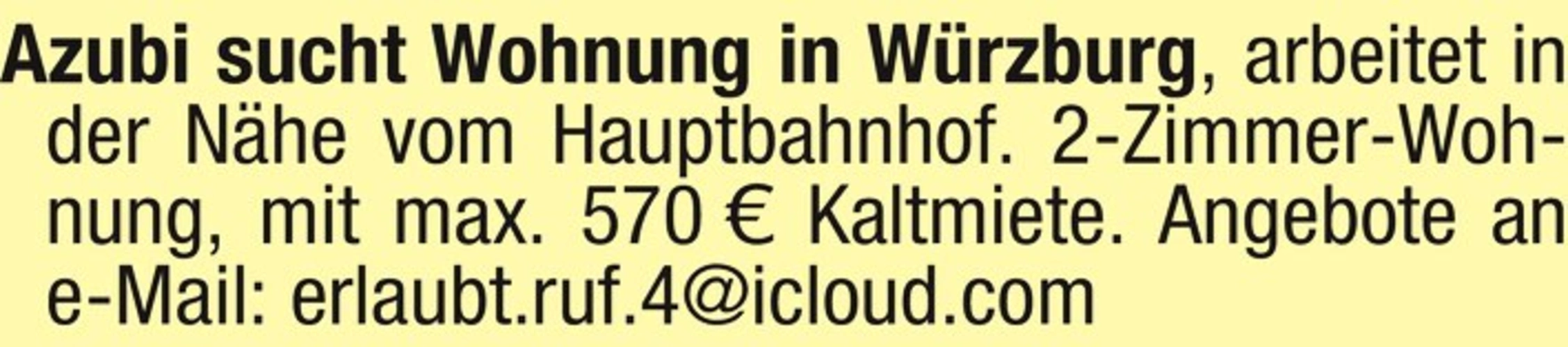 Azubi sucht Wohnung in Wrzburg, arbeitet in der Nhe vom Hauptbahnhof. 2-Zimmer-Wohnung, mit max. 570 Kaltmiete. Angebote an e-Mail: erlaubt.ruf.4@icloud.com