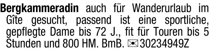 Bergkammeradin auch für Wanderurlaub im Gästehaus gesucht, passend ist eine sportliche, gepflegte Dame bis 72 J., fit für Touren bis 5 Stunden und 800 HM.