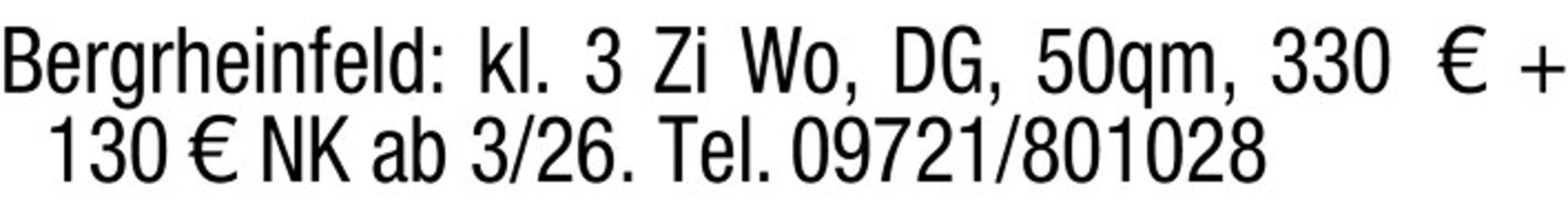 Bergrheinfeld: kl. 3 Zi Wo, DG, 50qm, 330 130 NK ab 3/26. Tel. 09721/801028