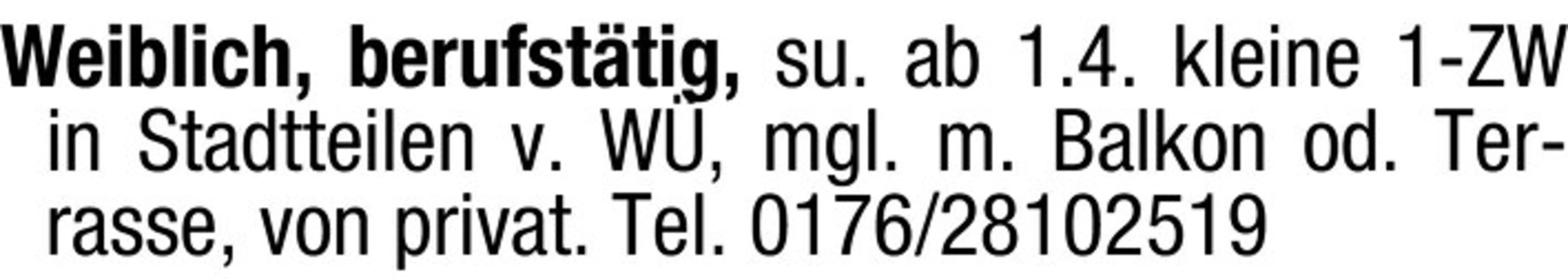 Weiblich, berufsttig, su. ab 1.4. kleine 1-ZW in Stadtteilen v. W, mgl. m. Balkon od. Terrasse, von privat. Tel. 0176/28102519