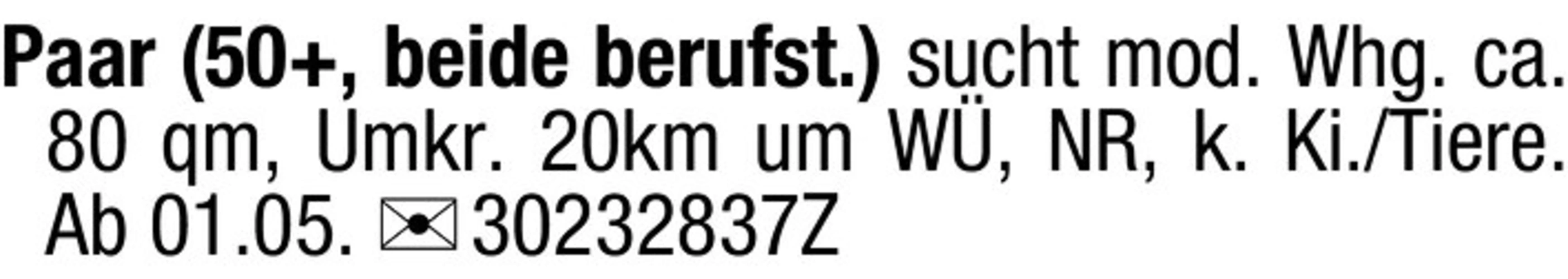 Paar (50 , beide berufst.) sucht mod. Whg. ca. 80 qm, Umkr. 20km um W, NR, k. Ki./Tiere. Ab 01.05. Chiffre 30232837