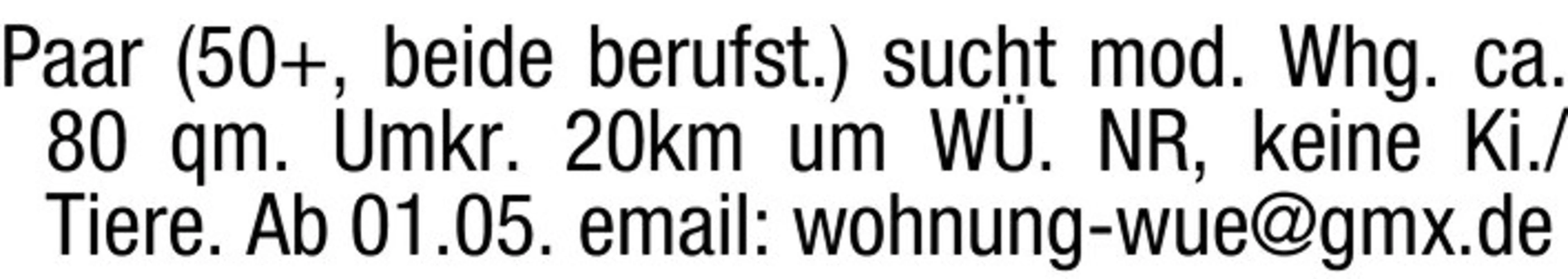 Paar (50 , beide berufst.) sucht mod. Whg. ca. 80 qm. Umkr. 20km um W. NR, keine Ki./Tiere. Ab 01.05. email: wohnung-wue@gmx.de