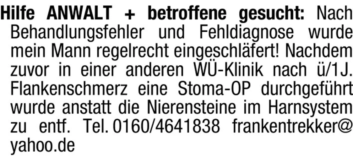 Betroffene gesucht: Nach Behandlungsfehler und Fehldiagnose wurde mein Mann regelrecht eingeschläfert! Nachdem zuvor in einer anderen W-Klinik nach /1J. Flankenschmerz eine Stoma-OP durchgeführt wurde anstatt die Nierensteine im Harnsystem zu entfernen.