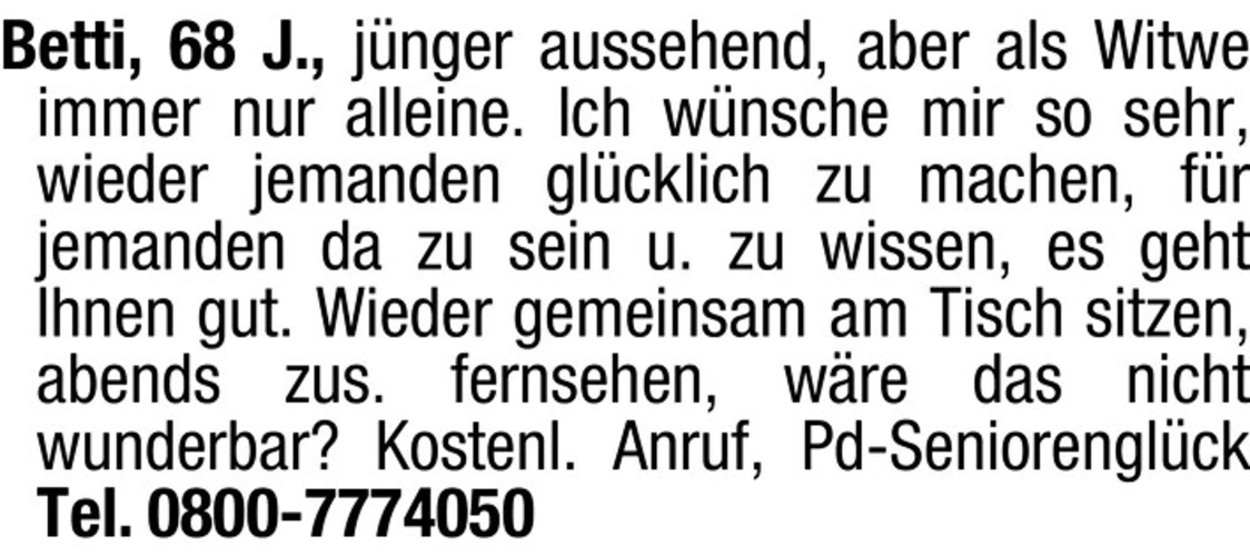 text Betti, 68 J., jnger aussehend, aber als Witwe immer nur alleine. Ich wnsche mir so sehr, wieder jemanden glcklich zu machen, fr jemanden da zu sein u. zu wissen, es geht Ihnen gut. Wieder gemeinsam am Tisch sitzen, abends zus. fernsehen, wre das nichtwunderbar? Kostenl. Anruf, Pd-Seniorenglck Tel. 0800-7774050