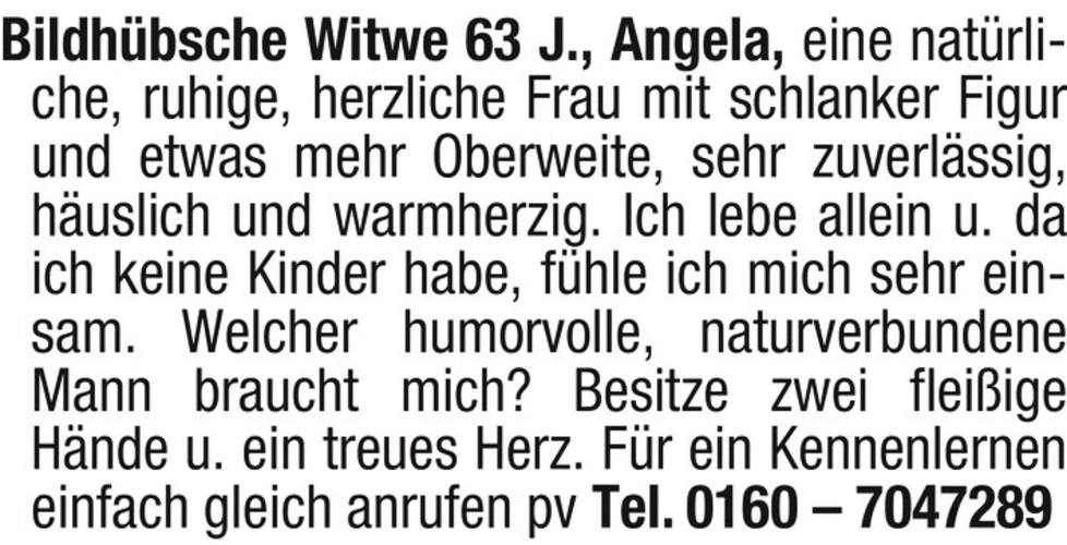text Bildhbsche Witwe 63 J., Angela, eine natrliche, ruhige, herzliche Frau mit schlanker Figur und etwas mehr Oberweite, sehr zuverlssig, huslich und warmherzig. Ich lebe allein u. da ich keine Kinder habe, fhle ich mich sehr einsam. Welcher humorvolle, naturverbundene Mann braucht mich? Besitze zwei fleiige Hnde u. ein treues Herz. Fr ein Kennenlernen einfach gleich anrufen pv Tel. 0160 - 7047289