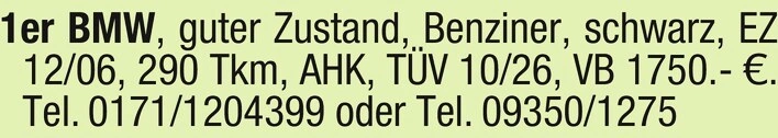 text 1er BMW, guter Zustand, Benziner, schwarz, EZ 12/06, 290 Tkm, AHK, TV 10/26, VB 1750.- . Tel. 0171/1204399 oder Tel. 09350/1275