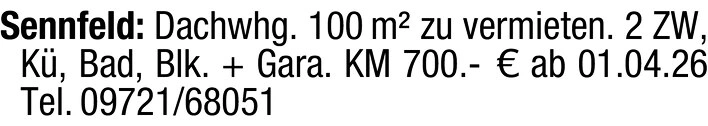 Sennfeld: Dachwhg. 100 m zu vermieten.