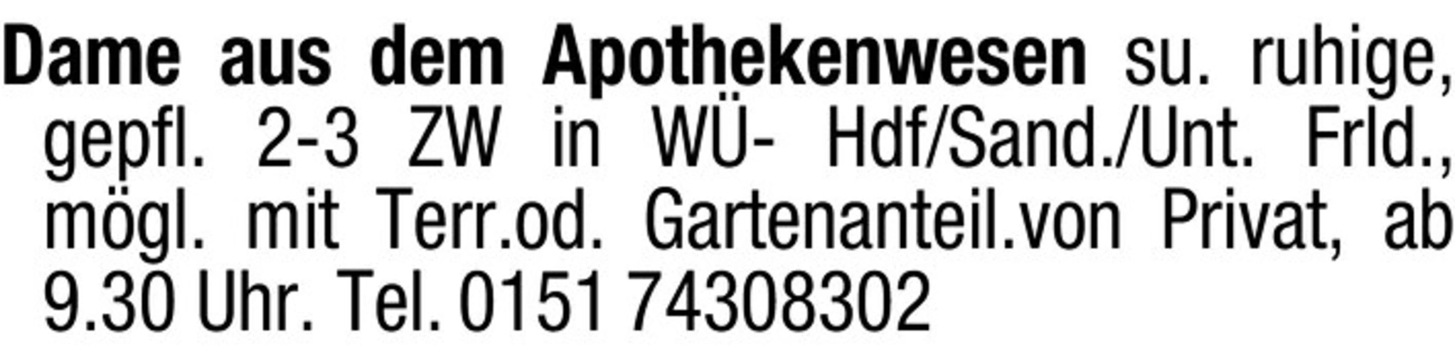 text Dame aus dem Apothekenwesen su. ruhige, gepfl. 2-3 ZW in W- Hdf/Sand./Unt. Frld., mgl. mit Terr.od. Gartenanteil.von Privat, ab 9.30 Uhr. Tel. 0151 74308302