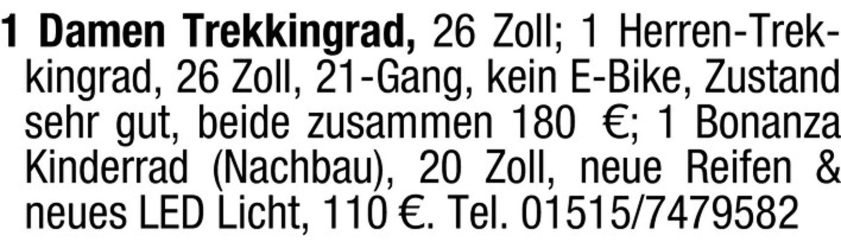 1 Damen Trekkingrad, 26 Zoll; 1 Herren-Trekkingrad, 26 Zoll, 21-Gang, kein E-Bike, Zustand sehr gut, beide zusammen 180 ; 1 Bonanza Kinderrad (Nachbau), 20 Zoll, neue Reifen & neues LED Licht, 110 . Tel. 01515/7479582