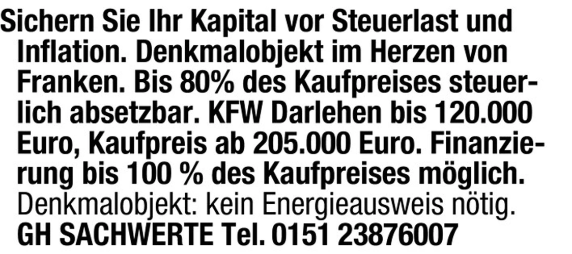 Sichern Sie Ihr Kapital vor Steuerlast und Inflation. Denkmalobjekt im Herzen von Franken. Bis 80% des Kaufpreises steuerlich absetzbar. KFW Darlehen bis 120.000 Euro, Kaufpreis ab 205.000 Euro. Finanzierung bis 100 % des Kaufpreises mglich.Denkmalobjekt: kein Energieausweis ntig. GH SACHWERTE Tel. 0151 23876007
