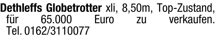 Dethleffs Globetrotter xli, 8,50m, Top-Zustand, fr 65.000 Euro zu verkaufen. Tel. 0162/3110077