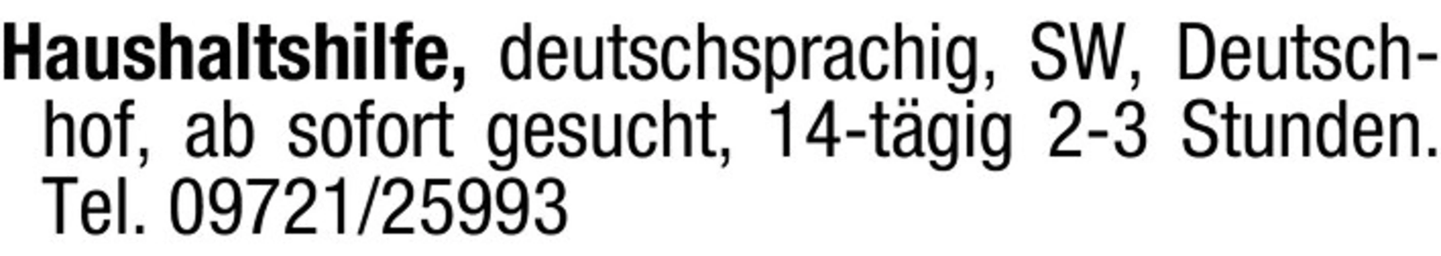 Haushaltshilfe, deutschsprachig, SW, Deutschhof, ab sofort gesucht, 14-tgig 2-3 Stunden.Tel. 09721/25993