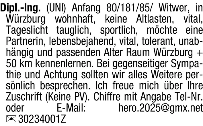 Witwer, in Würzburg wohnhaft, keine Altlasten, vital, Tageslicht tauglich, sportlich