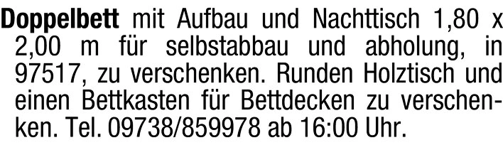 Doppelbett mit Aufbau und Nachttisch 1,80 x 2,00 m für Selbstabbau und Abholung in 97517, zu verschenken.