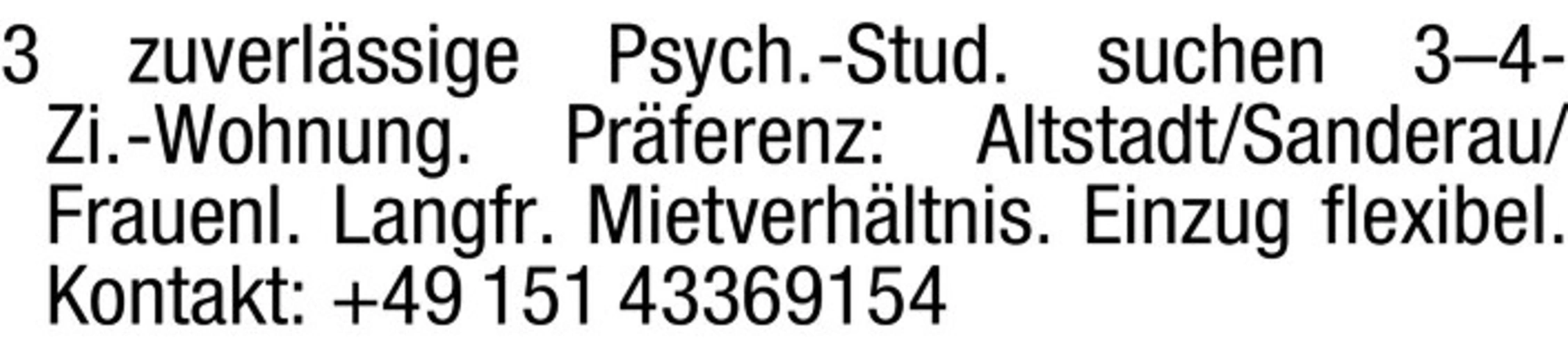 3 zuverlässige Psych.-Stud. suchen 3-4-Zi.-Wohnung.