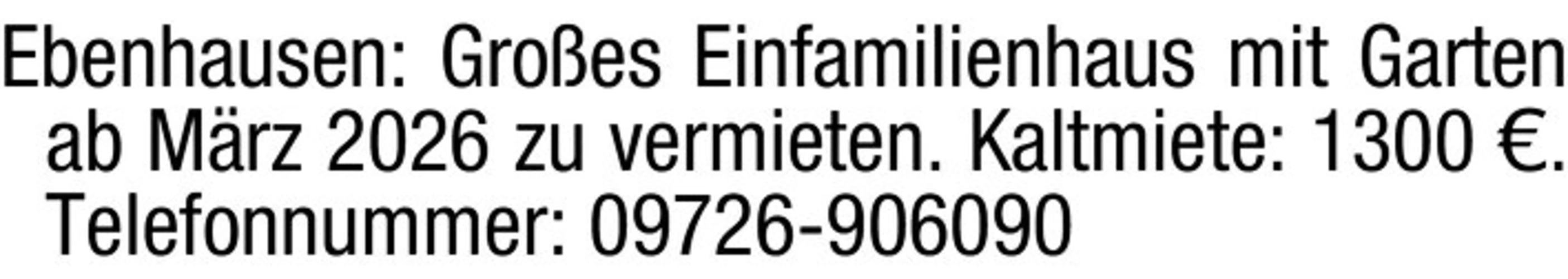 Ebenhausen: Groes Einfamilienhaus mit Garten ab Mrz 2026 zu vermieten. Kaltmiete: 1300 . Telefonnummer: 09726-906090