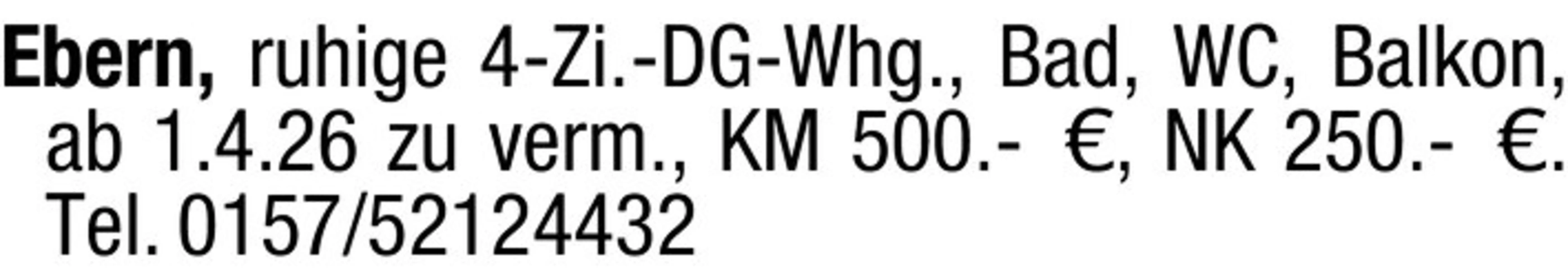 Ebern, ruhige 4-Zi.-DG-Whg., Bad, WC, Balkon, ab 1.4.26 zu verm., KM 500.- , NK 250.- . Tel. 0157/52124432