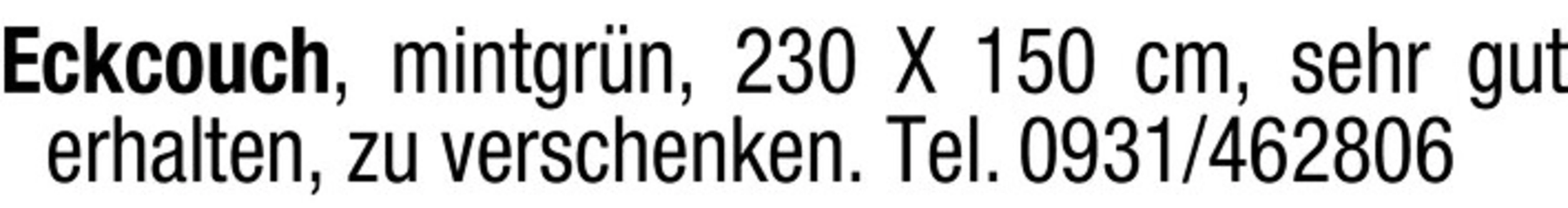 Eckcouch, mintgrn, 230 X 150 cm, sehr gut erhalten, zu verschenken. Tel. 0931/462806