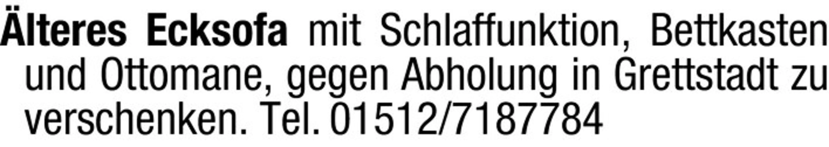 Älteres Ecksofa mit Schlaffunktion, Bettkasten und Ottomane, gegen Abholung in Grettstadt zu verschenken.