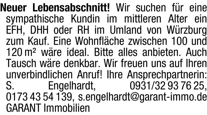 Neuer Lebensabschnitt! Wir suchen für eine sympathische Kundin im mittleren Alter ein EFH, DHH oder RH im Umland von Würzburg zum Kauf. Eine Wohnfläche zwischen 100 und 120 m² wäre ideal. Bitte alles anbieten. Auch Tausch wäre denkbar. Wir freuen uns auf Ihren unverbindlichen Anruf!