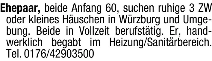 Ehepaar, beide Anfang 60, suchen ruhige 3 ZW oder kleines Häuschen in Würzburg und Umgebung. Beide in Vollzeit berufstätig. Er, handwerklich begabt im Heizung/Sanitärbereich. Tel. 0176/42903500