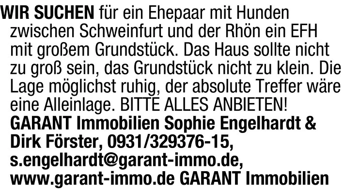 WIR SUCHEN fr ein Ehepaar mit Hunden zwischen Schweinfurt und der Rhn ein EFH mit groem Grundstck. Das Haus sollte nicht zu gro sein, das Grundstck nicht zu klein. Die Lage mglichst ruhig, der absolute Treffer wre eine Alleinlage. BITTE ALLES ANBIETEN! GARANT Immobilien Sophie Engelhardt & Dirk Frster, 0931/329376-15, s.engelhardt@garant-immo.de, www.garant-immo.de GARANT Immobilien