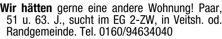 Paar, 51 und 63 Jahre alt, sucht im Erdgeschoss eine 2-Zimmer-Wohnung in Veitshöchheim oder einer Randgemeinde.