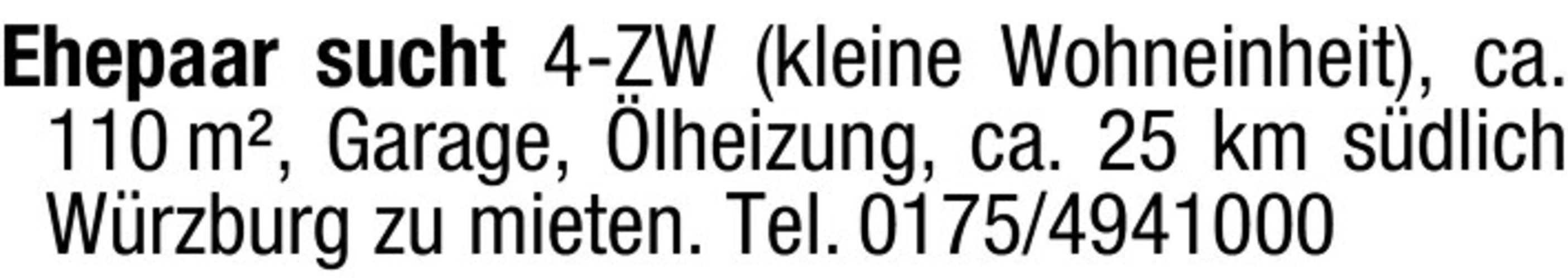 Ehepaar sucht 4-ZW (kleine Wohneinheit), ca. 110 m², Garage, Heizung, ca. 25 km südlich Würzburg zu mieten. Tel. 0175/4941000