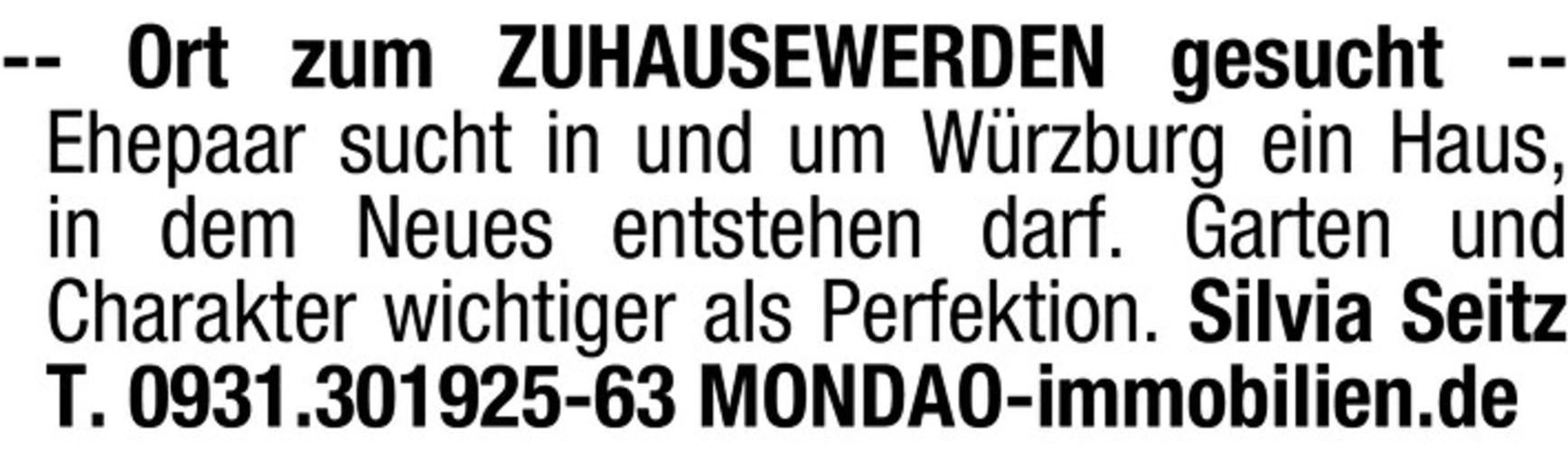 • Ort zum ZUHAUSEWERDEN gesucht -Ehepaar sucht in und um Wrzburg ein Haus,in dem Neues entstehen darf. Garten undCharakter wichtiger als Perfektion. Silvia SeitzT. 0931.301925-63 MONDAO-immobilien.de