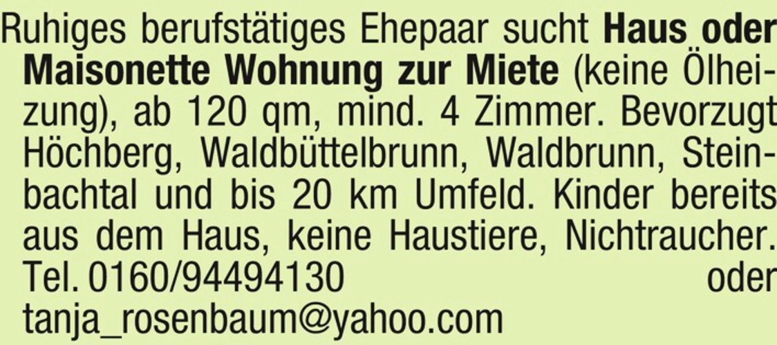 Haus oder Maisonette Wohnung zur Miete (keine Heizung), ab 120 qm, mind. 4 Zimmer. Bevorzugt Höchberg, Waldbüttelbrunn, Waldbrunn, Steinbachtal und bis 20 km Umfeld.