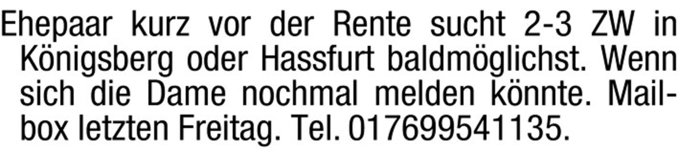 Ehepaar kurz vor der Rente sucht 2-3 ZW in Knigsberg oder Hassfurt baldmglichst. Wenn sich die Dame nochmal melden knnte. Mailbox letzten Freitag. Tel: 017699541135.