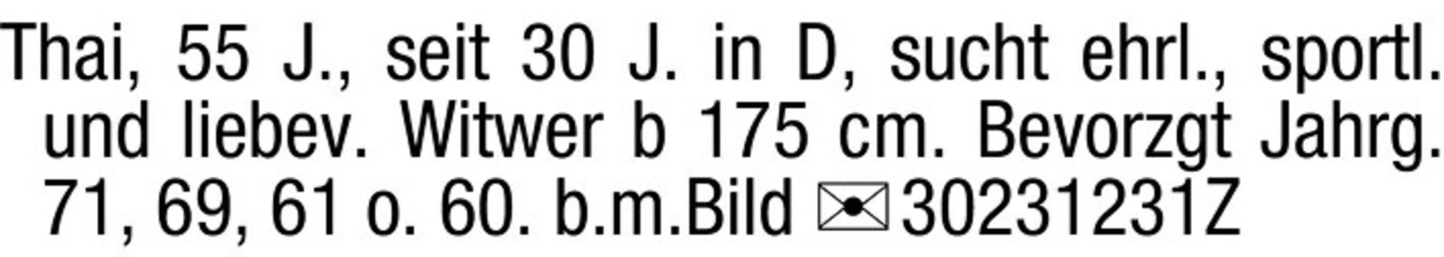 Thai, 55 J., seit 30 J. in D, sucht ehrl., sportl. und liebev. Witwer b 175 cm. Bevorzgt Jahrg. 71, 69, 61 o. 60.