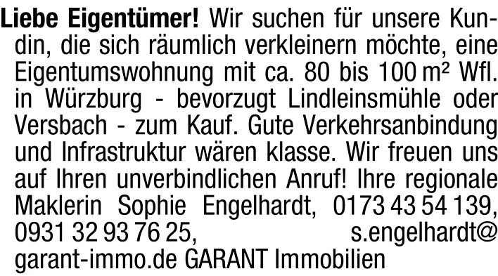 Wir suchen für unsere Kundin, die sich räumlich verkleinern möchte, eine Eigentumswohnung mit ca. 80 bis 100 m² Wfl. in Würzburg - bevorzugt Lindleinsmühle oder Versbach - zum Kauf.