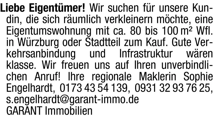 Wir suchen für unsere Kundin, die sich räumlich verkleinern möchte, eine Eigentumswohnung mit ca. 80 bis 100 m² Wfl. in Würzburg oder Stadtteil zum Kauf.