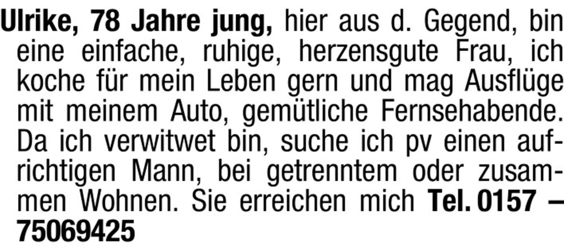 Ulrike, 78 Jahre jung, hier aus d. Gegend, bin eine einfache, ruhige, herzensgute Frau, ich koche fr mein Leben gern und mag Ausflge mit meinem Auto, gemtliche Fernsehabende. Da ich verwitwet bin, suche ich pv einen aufrichtigen Mann, bei getrenntem oder zusammen Wohnen. Sie erreichen mich Tel. 0157 - 75069425