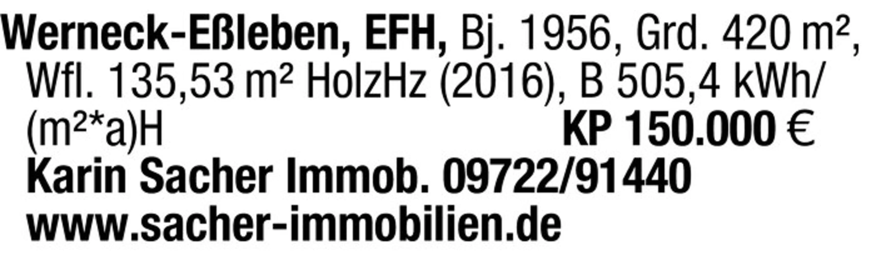 Werneck-Eleben, EFH, Bj. 1956, Grd. 420 m, Wfl. 135,53 m HolzHz (2016), B 505,4 kWh/(m*a)H KP 150.000 Karin Sacher Immob. 09722/91440www.sacher-immobilien.de