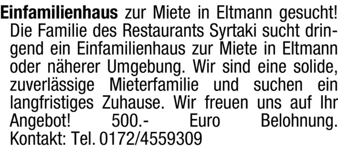 Die Familie des Restaurants Syrtaki sucht dringend ein Einfamilienhaus zur Miete in Eltmann oder näherer Umgebung. Wir sind eine solide, zuverlässige Mieterfamilie und suchen ein langfristiges Zuhause.